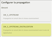 Par défaut, le mode « Amont » est activé. ! Si un point de départ est déjà sélectionné, le passage d’un mode à l’autre, exécute automatiquement la propagation à partir de ce point de départ. |
