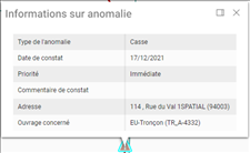 Consulte les informations d’une anomalie sous la forme d’une fenêtre contextuelle en cliquant dessus dans la carte. ! Cette fonctionnalité est disponible uniquement si la thématique « Anomalie » est activée. |