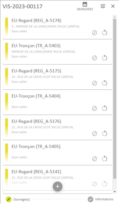 jour dans la liste et dans la carte avec le code couleur associé. ! Si l’ouvrage a été ajouté au cours de l’opération de visite courante (non programmé à la préparation), il est retiré de la visite et n’apparait plus, ni dans la liste, ni dans la carte. |