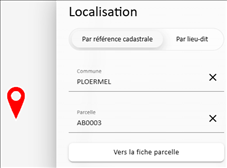 de consultation du cadastre, le bouton « Vers la fiche parcelle » est activé. La carte se cadre et affiche un pin’s sur la parcelle