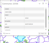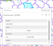 L’élément est mis en évidence dans la carte avec la couleur de l’élément courant dans la sélection. Les autres éléments sont mis en évidence avec la couleur de sélection. Les informations de l’objet courant de la sélection s’affichent dans le formulaire.