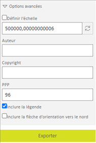 Permet d’utiliser l’échelle courante de la carte ou de définir une échelle à utiliser. Permet d’indiquer, en plus du titre éventuellement déjà défini, d’autres éléments à afficher dans le résultat de l’export : l’échelle, l’auteur (par défaut : l’utilisateur connecté), le Copyright, la résolution (PPP/DPI. Valeur par défaut= 96), la légende (case cochée par défaut) et la flèche d’orientation vers le Nord.