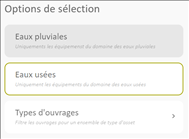 des ouvrages du curage s’actualise. ► Aucune option sélectionnée : tous les ouvrages du curage sont présents dans la liste. ► Option « A faire » sélectionnée : les ouvrages qui restent à faire à la date de l’opération de curage courante sont présents dans la liste. ► Option « Fait » sélectionnée : les ouvrages qui sont réalisés à la date de l’opération de curage courante sont présents dans la liste. ► Option « Inaccessible » sélectionnée : les ouvrages