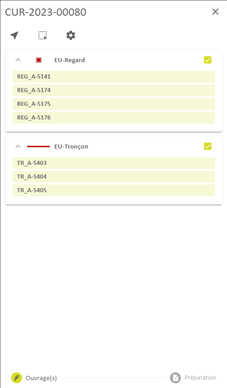 L’ouvrage est ajouté au curage pour l’opération de curage courante. ! L’état de l’ouvrage est automatiquement passé à « curé ». L’ouvrage apparait avec cet état dans la liste et dans la carte. ! La sélection applique une priorité par rapport à une zone de tolérance avec d’abord les ponctuels puis les linéaires. |