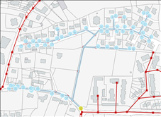 Propagation en aval : permet à l’utilisateur de rechercher les collecteurs en aval d’un point du réseau, pour simuler la propagation d’une pollution dans le réseau d’assainissement. |