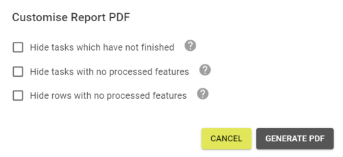 - A Submission Report. This can be customised to hide tasks which have not finished, and tasks and/or classes with no processed features.
