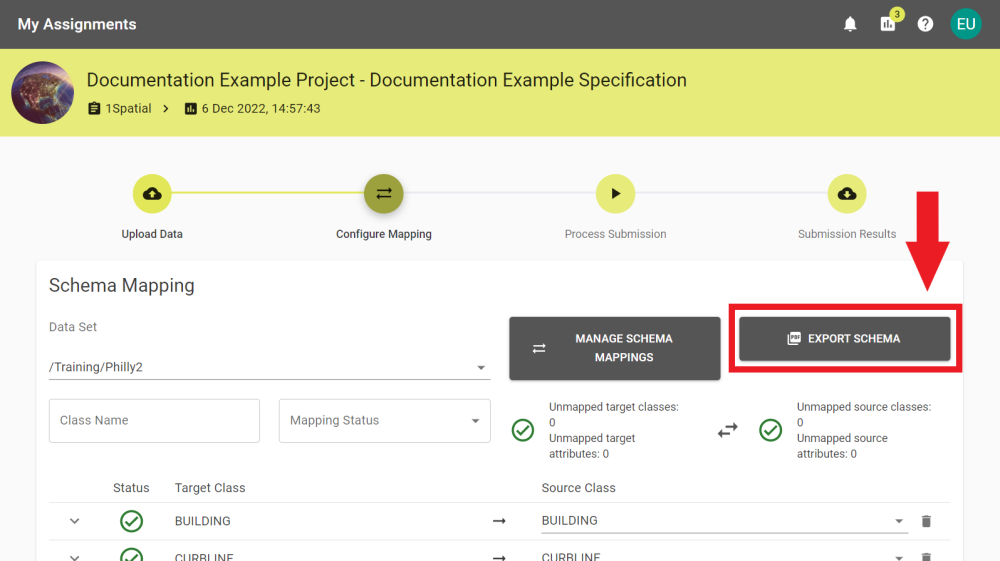 Schema Mapping takes a Source Class and maps it to a Target Class. These can be changed by clicking their drop down menus.