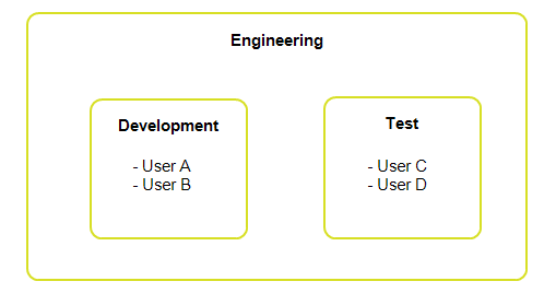 We might have a group "Engineering" that also contains two sub-groups "Development" and "Test", with users in each of these groups as pictured below.