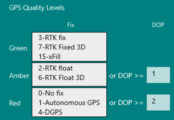 If the Fix is No Fix, Autonomous GPS, DGPS, OR the DOP is greater than or equal to 2, then a Red quality level is indicated.