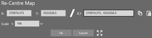 Enter coordinates to center the map and the display scale. Input coordinates as individual X and Y values or together in X,Y format. Click OK to center the map on this location.