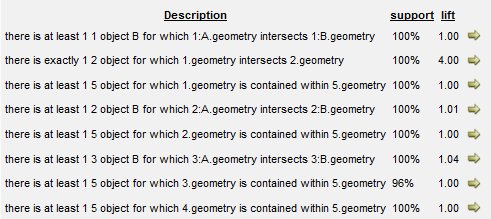 Click Description, support, or lift to sort the results based on the values in that column. Lift and support are measures of the confidence the discovery algorithm has in the suggested rule. Higher numbers suggest greater confidence.