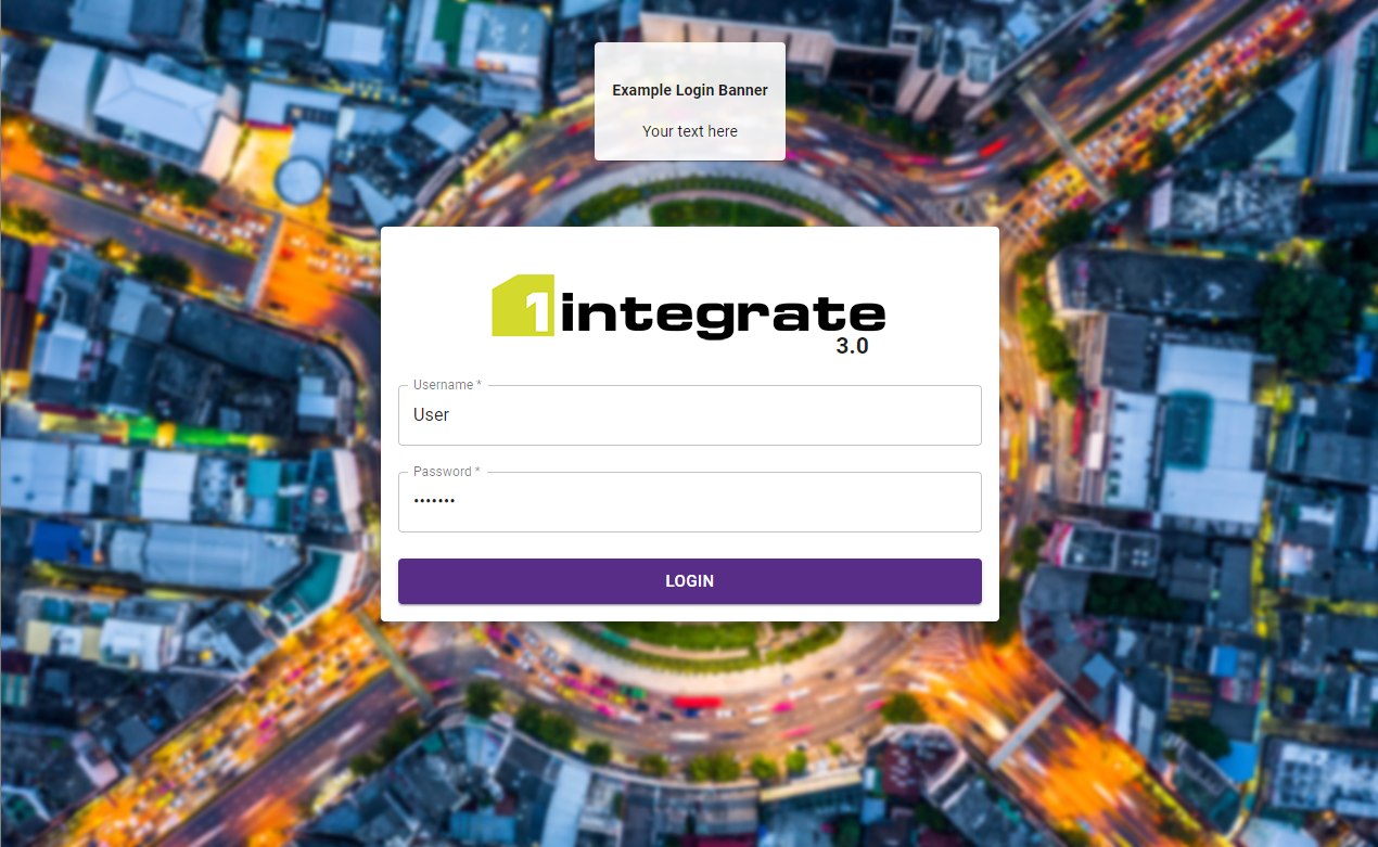You can configure a login banner to appear at the top of the login page to include additional text for your users. This banner will not replace the 1Integrate login graphics or logo, but will appear at the top of the page.