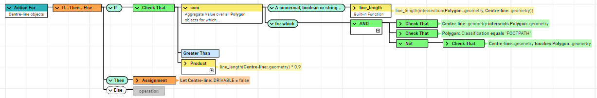 In the example shown below, the action sets a road "Centre-line" to be non-drivable if it is at least 90% within "Footpath" polygons.