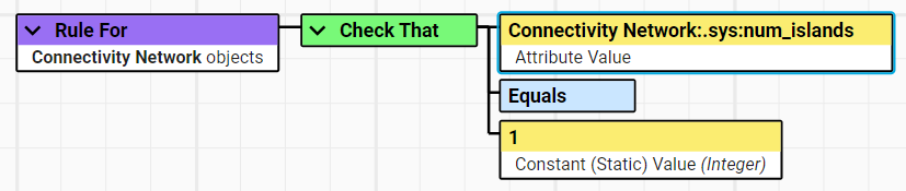 In the following example, a Rule uses the num_islands network attribute to validate the network graph coherence. The name field is not applicable so has not been used.