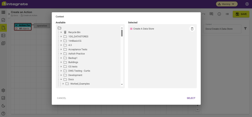 Click Context to open the Data Store selection and choose the Data Store that you created.