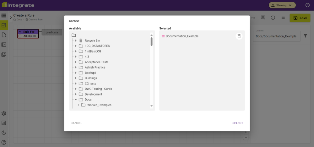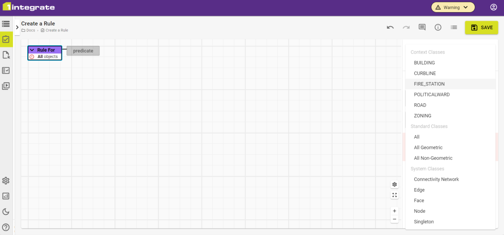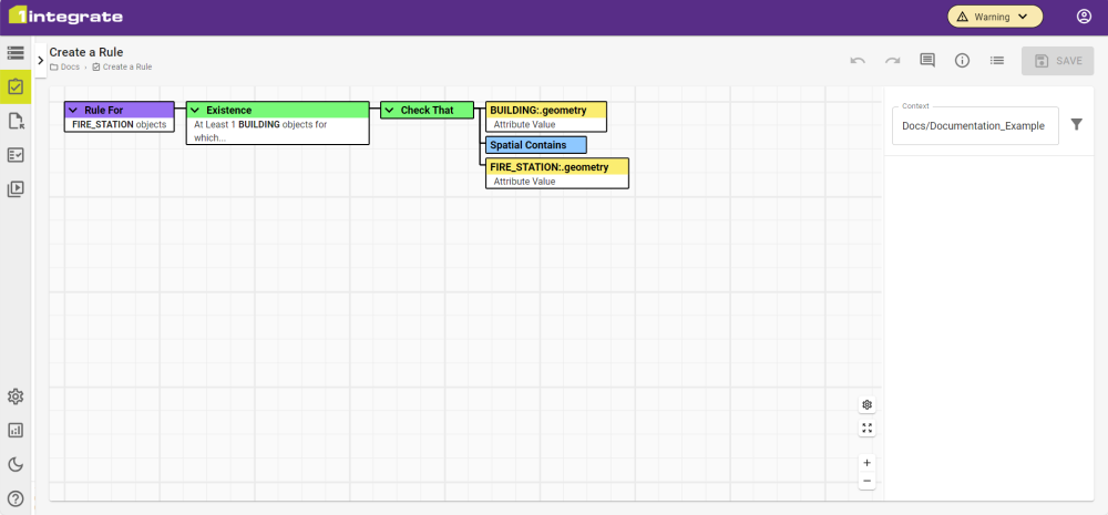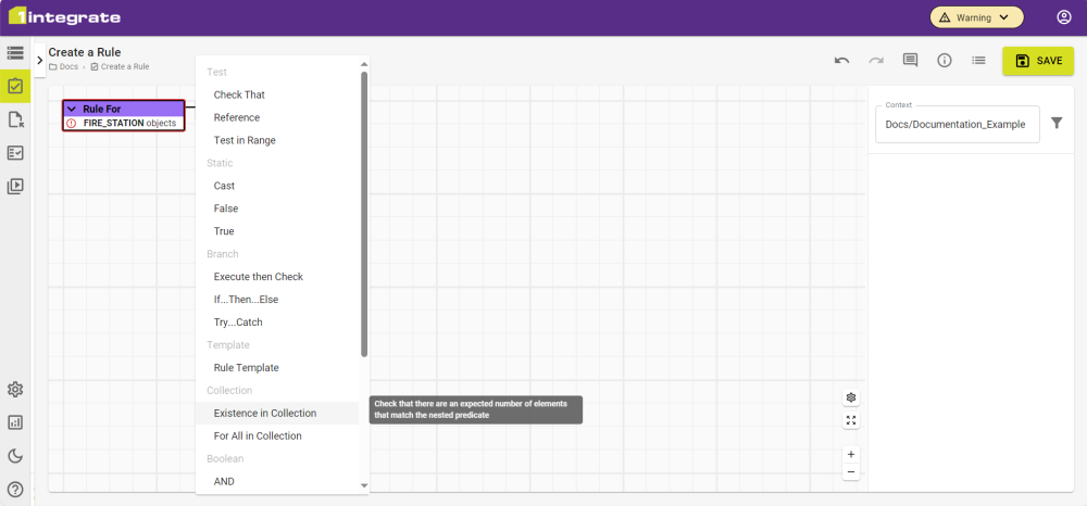 As the Data Store has been set up, it can be connected to the Rule via the Context at the top of the Right Hand Panel. This links the data in the Data Store to the Rule, allowing the classes and attributes within the data to be referenced.