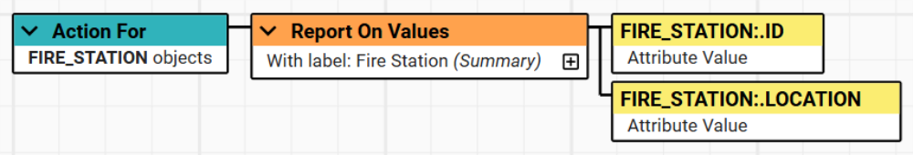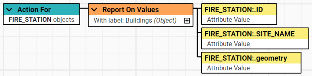 The non-conformances however, can be passed directly to an Action by using an Action Map. The example below is the Action that will take the ID, SITE_NAME, and geometry of those FIRE_STATION non-conformances and put them into a report using the Report on Values Operation.
