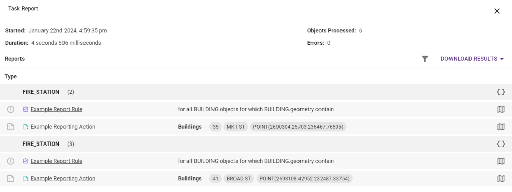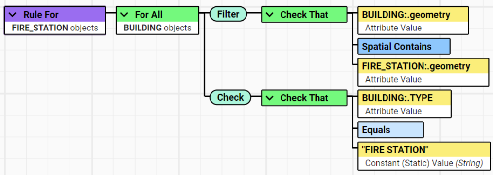 The image below shows a Rule identifying FIRE_STATION objects that are contained within BUILDING objects. If this occurs, then any BUILDINGs with the Type "FIRE STATION" will pass the Rule.
