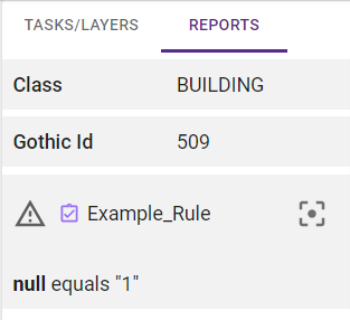 For each object, the report panel displays the object's Class, Gothic ID, and the name and description of the Rule(s) that the object failed.