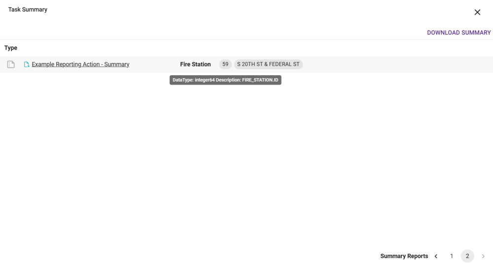 Actions with a Report on Values Operation set to Summary Scope will create a further page in the Summary, with the details that the Operation is set to report.