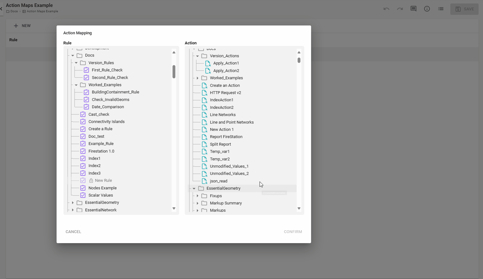 Single Rule to Folder of Actions pair - If a feature triggers a non-conformance on the Rule, all Actions in the folder are executed one by one against the feature.