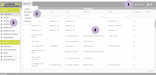 Nom de l’utilisateur connecté et bouton de déconnexion. |