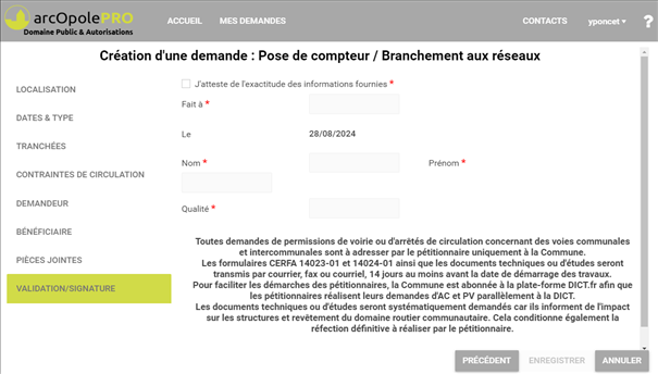 La dernière étape de la création de la demande consiste à attester de l’exactitude de la demande et à la dater :