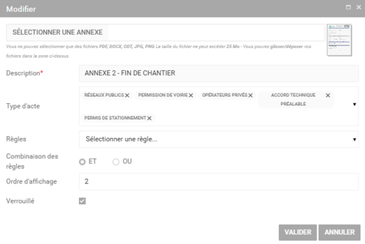 Règles de positionnement automatique de l’annexe dans les actes. La création de ces règles est présentée dans la partie 5.3 de ce manuel. |
