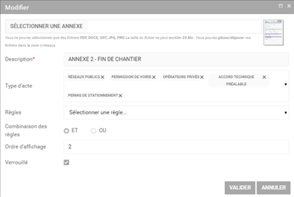 Sélection du ou des types d’actes pour lesquels cette annexe sera proposée. Dans cet exemple, cette annexe ne sera disponible que pour les actes de type « Arrêté permanent ». |