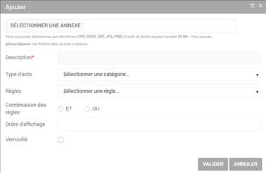 L’onglet Annexes contient l’intégralité des annexes proposées dans les actes générés par le module arcOpole PRO DPA. Ces documents joints peuvent être ajoutés au format image, document ou pdf.