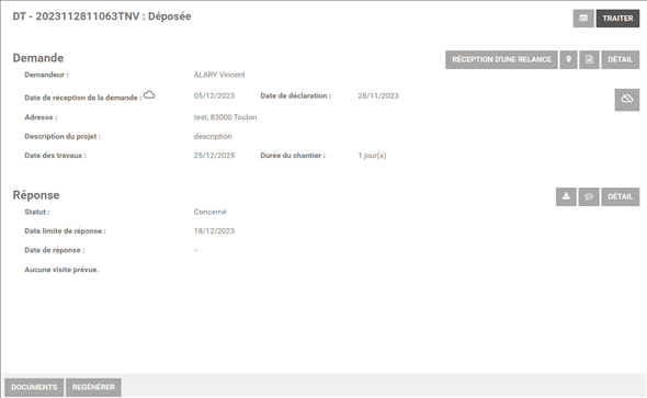 Responsable avec la réponse à la DICT. Ici, dans le cas d’une Demande traitée. |