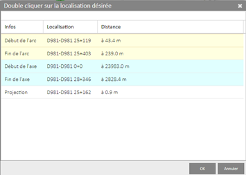 Dans cet exemple, votre clic se situe à 0,9 m du point le plus proche sur l’axe, à 43,4 m du début de l’arc, … Si vous souhaitez utiliser un de ces éléments pour la localisation, le sélectionner puis cliquer sur « Ok ». |