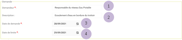 Le demandeur est renseigné automatiquement par l’application. Il s’agit de l’utilisateur connecté. Il est possible de saisir un autre demandeur. Cette information est obligatoire. |