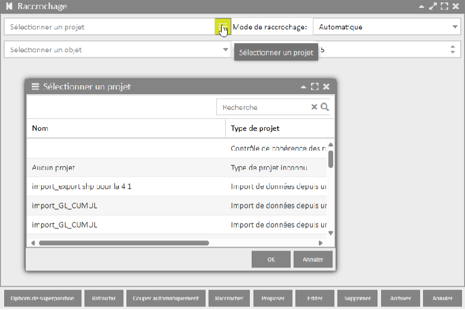 - Interface de raccrochage : Modification de la sélection d'un projet, amélioration des temps de réponses et icône sur la cause du décrochage