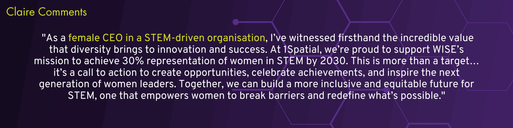 At 1Spatial, we believe in the power of diversity and inclusion to drive innovation and success. Being a female-led organisation, we understand the important role women in STEM play and why we support WISE’s (Women into Science and Engineering) drive to achieve 30% representation of women in STEM roles by 2030.