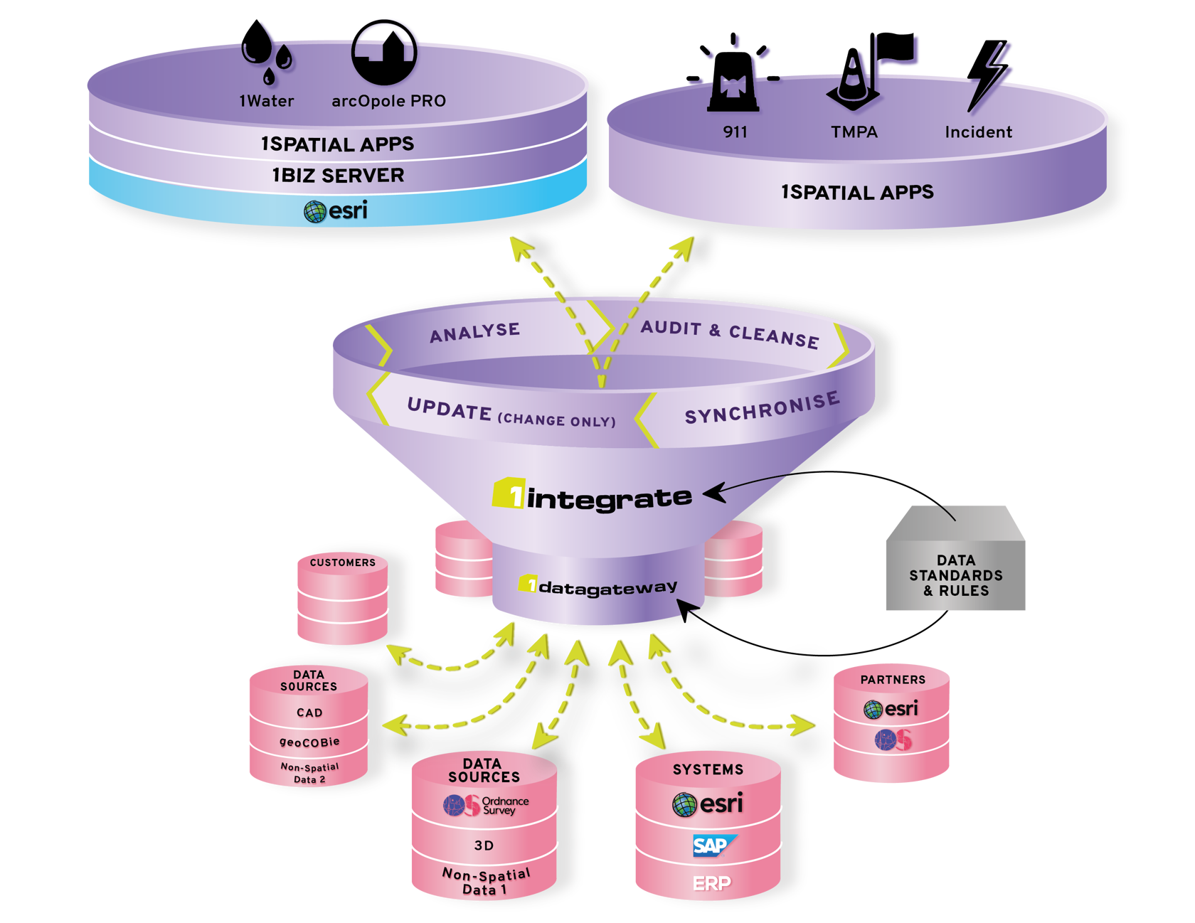 The 1Spatial Platform is a complete set of Location Master Data Management (LMDM) software components, which combines servers, portals, dashboards, SDKs, APIs, data connectors, business-focused applications and our patented 1Integrate rules engine.